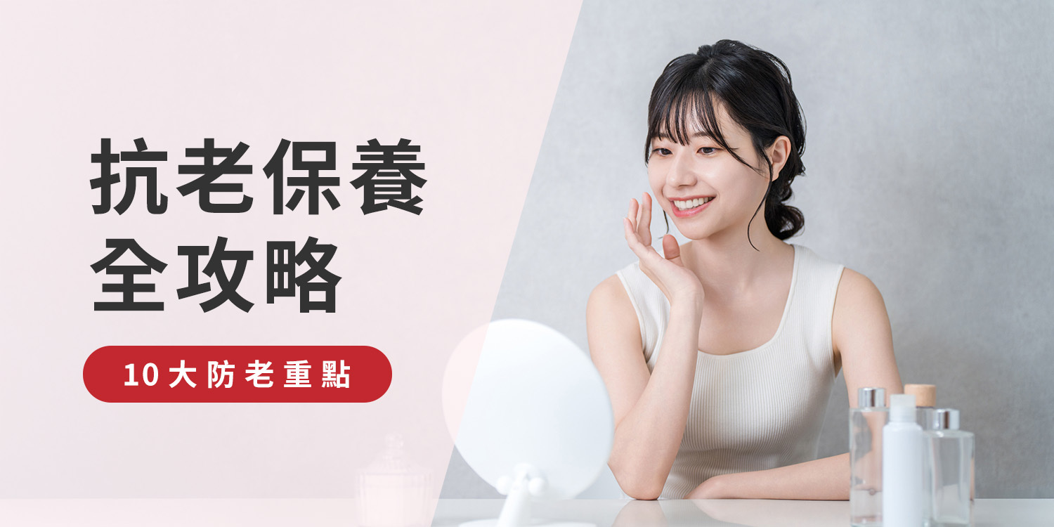 抗老保養全攻略!抗老10大重點不可不知日本好愛買編輯部 發布日期:2026-03-xx 隨著年齡增長,肌膚逐漸出現乾燥、細紋與鬆弛等問題,抗老保養也成為許多人關注的保養課題,希望透過日常保養維持肌膚的彈性與光澤。本篇由日本好愛買編輯部整理抗老保養必知觀念,從肌膚老化原因到抗老成分解析,帶你一次了解分區抗老重點與抗老保養品挑選方法。 為什麼要開始抗老保養?「抗老保養幾歲開始比較好?」其實是許多人在開始關注肌膚保養時常見的疑問。有些人認為只有出現細紋或鬆弛後才需要抗老,但事實上,抗老保養並不只是針對皺紋或鬆弛,而是透過日常保養維持肌膚健康與穩定狀態。當肌膚保持良好的保濕、防護與修護能力時,自然更能延緩老化問題的出現,讓肌膚長時間維持細緻與光澤。 肌膚老化的5大原因肌膚老化通常與多種因素有關,其中最常見的包括以下五種:原因一:紫外線傷害長時間曝曬在紫外線下,容易破壞肌膚中的膠原蛋白與彈力蛋白,是造成肌膚老化的重要原因之一。原因二:膠原蛋白流失隨著年齡增長,人體生成膠原蛋白的速度會逐漸下降,使肌膚彈性逐漸下降,容易出現細紋與鬆弛。原因三:角質代謝不正常當肌膚角質代謝變慢時,老廢角質容易堆積,可能使肌膚看起來粗糙、暗沉,也會影響保養品吸收。原因四:氧化與自由基環境污染與壓力會產生自由基,造成肌膚氧化,進而影響肌膚彈性與健康狀態。原因五:飲食習慣及生活作息長期作息不規律、壓力過大或飲食不均衡,可能影響肌膚修復能力與膚況穩定度。 你必須知道的抗老10大重點了解肌膚老化原因後,建立正確的抗老保養觀念也相當重要。抗老保養並不是單一產品就能解決,而是需要從不同肌膚需求與保養習慣著手。以下整理出常見的抗老保養10大重點,幫助你在日常保養中更有方向。重點一. 眼周保養不可忽略 眼周肌膚較薄,也較容易出現細紋與乾紋,因此建議選擇質地溫和、具有保濕與修護效果的保養品,加強眼周保養。重點二. 加強肌膚保濕 保濕是抗老保養的重要基礎。當肌膚水分充足時,不僅能維持肌膚彈性,也能減少乾紋與細紋出現。重點三. 注意防曬 紫外線是造成肌膚老化的重要因素之一,因此日常防曬也是抗老保養的重要步驟。重點四. 適度補充抗氧化保養 抗氧化成分能幫助肌膚抵抗環境壓力與自由基影響,讓肌膚維持健康狀態。重點五. 建立規律保養習慣 持續且規律的保養,比短期密集保養更重要。建立固定的保養習慣,能讓肌膚長時間維持穩定。重點六. 注意角質調理 適度調理角質能幫助肌膚維持正常代謝,也能讓後續保養品更容易吸收。重點七. 選擇適合的抗老成分 像是胜肽、維他命C或神經醯胺等成分,都是常見的抗老保養成分。重點八. 留意肌膚彈性變化 當肌膚開始出現鬆弛或彈性下降時,可以選擇具有緊緻效果的保養產品。重點九. 維持健康生活習慣 均衡飲食、充足睡眠與良好作息,也有助於維持肌膚健康。重點十. 選擇適合自己的抗老保養品 不同膚質與年齡階段,適合的抗老保養方式也會有所不同,因此挑選適合自己的產品相當重要。 抗老保養必備成分市面上的抗老保養品種類相當多,而不同產品的效果往往與所使用的保養成分有關。在挑選抗老保養品時,了解抗老保養成分的作用,也能幫助我們在挑選抗老保養品時更容易找到適合自己的產品。1. 維他命C(Vitamin C) 維他命C是常見的抗氧化保養成分,能幫助肌膚抵抗環境壓力,同時也有助於維持肌膚明亮與均勻膚色。2. A醇(Retinol) A醇屬於維他命A衍生物,是許多抗老保養品中常見的成分之一,常被用於改善細紋與肌膚粗糙問題。3. 胜肽(Peptide) 胜肽是近年保養品中常見的成分,能幫助維持肌膚彈性,使肌膚看起來更加緊緻。4. 神經醯胺(Ceramide) 神經醯胺是肌膚角質層的重要成分之一,能幫助強化肌膚屏障並維持肌膚保濕。5. 玻尿酸(Hyaluronic Acid) 玻尿酸具有良好的保水能力,能幫助肌膚補充水分,使肌膚看起來更加水潤與飽滿。好愛買抗老保養推薦一般在挑選保養品時,可以依照肌膚需求與保養重點來選擇產品。 ●加強眼周:針對眼周細紋與乾紋加強保養 眼周肌膚是臉部最薄且較容易出現老化跡象的部位之一,當肌膚保水力下降或長時間用眼時,眼周容易出現乾紋與細紋,可以選擇質地較為滋潤的眼霜或眼部精華來加強保養。眼霜通常具有良好的保濕效果,能幫助眼周肌膚維持水分,也能讓眼周肌膚看起來更加平滑細緻。 ●加強保濕修護:幫助肌膚維持水潤與健康狀態 當肌膚缺乏水分時,不僅容易出現乾燥與細紋,也可能影響整體膚況。如果想加強肌膚的保濕修護,可以透過精華類保養產品提升日常保養效果。推薦 PDRN光耀精華,清爽質地好吸收,適合作為日常保養的一環,幫助肌膚維持水潤與柔嫩。 ●恢復緊緻彈力:維持肌膚彈性與緊緻感 想維持肌膚的彈性與緊緻感,可以選擇含胜肽或A醇的保養品,這類成分常被應用於抗老保養品中,幫助肌膚維持柔嫩與彈性。日常保養中,也可以搭配質地滋潤的乳霜,加強肌膚的保養與呵護,例如選擇含胜肽成分的緊緻乳霜,作為日常保養的一環。 ●亮白抗老:讓肌膚看起來更加明亮細緻如果肌膚看起來較為暗沉,整體膚況也容易顯得疲憊或顯老,因此亮白保養也是抗老保養中不可忽略的一環。可使用高濃度穀胱精華,添加穀胱甘肽亮白成分,打造無瑕白玉肌,適合作