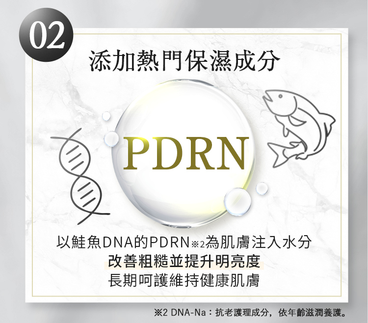 ● 醫美級核心成分 PDRN(鮭魚DNA),從肌底啟動原生修護力,由內而外呵護健康穩定。