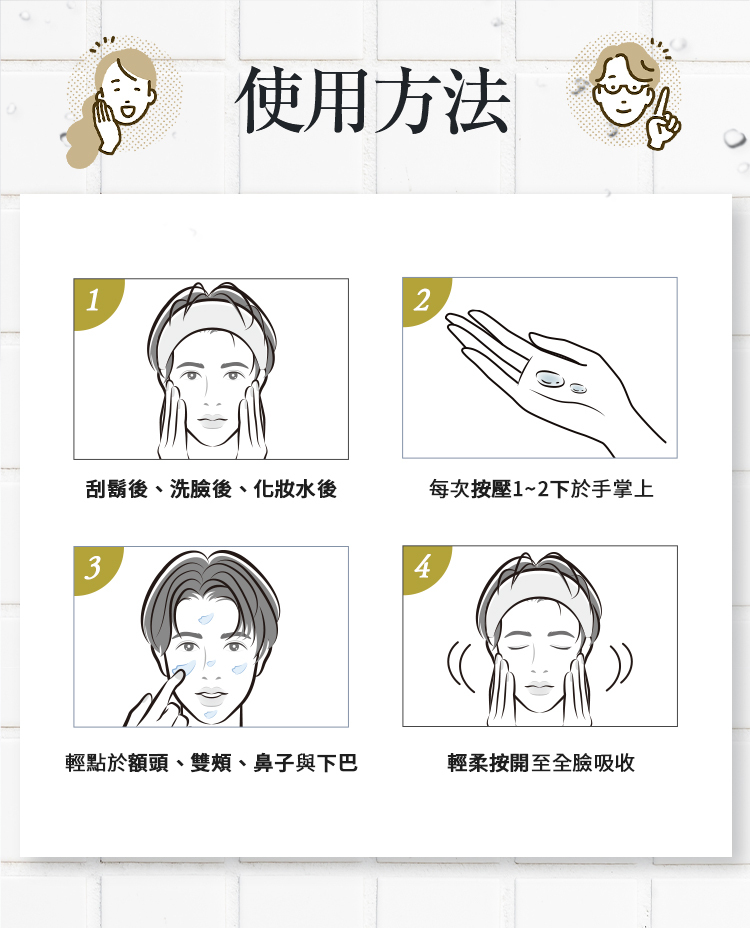 於刮鬍後、洗臉後,或使用化妝水調理肌膚之後使用。
